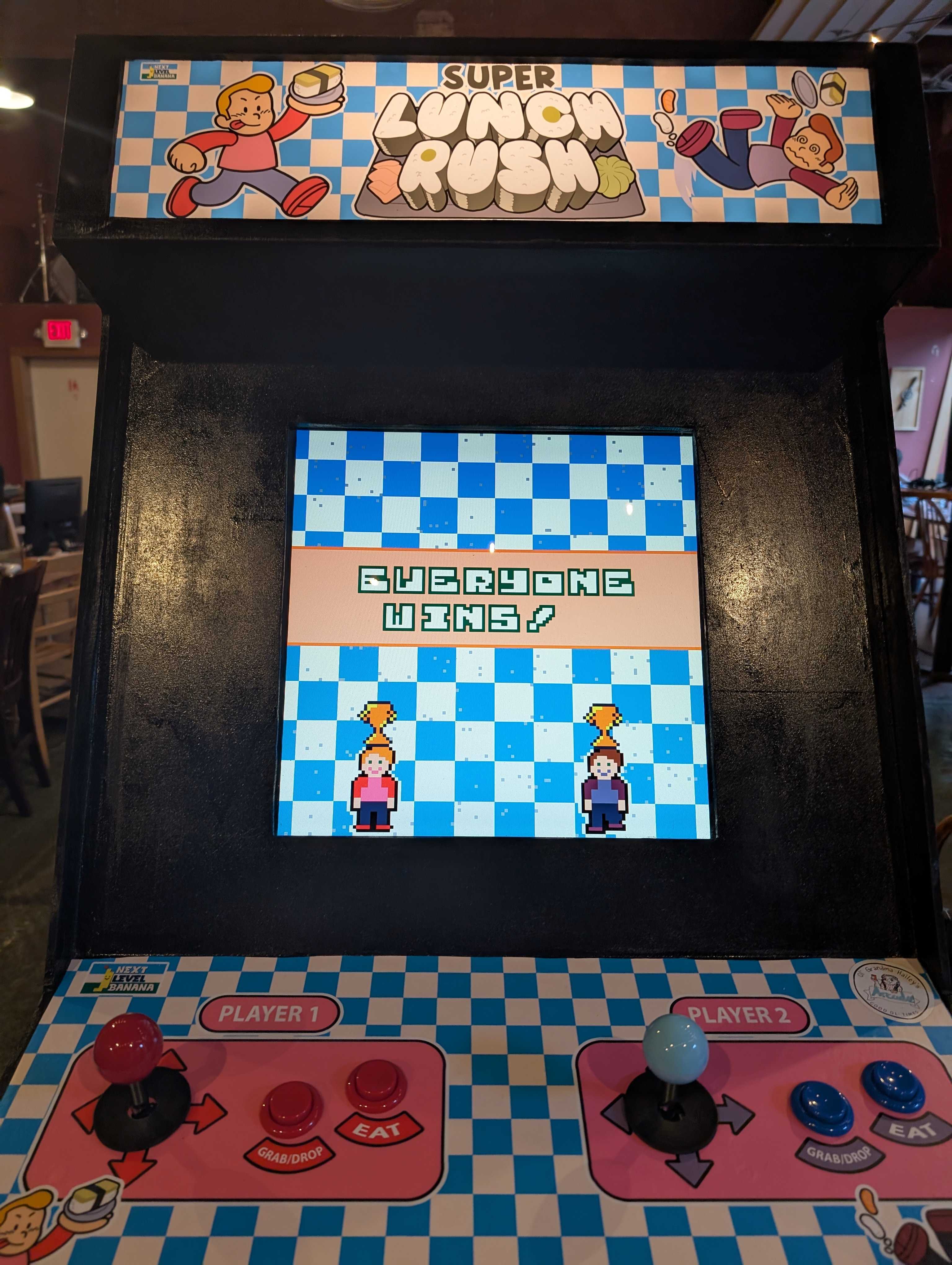 2 players. Button 1 is grab/drop, button 2 is eat. It's fun!